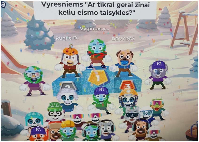 Klasėje netrūko emocijų: vienus atsakymus lydėjo džiaugsmingi šūksniai, kitus – atodūsis: „Žinojau, bet ne tą paspaudžiau…“. Gera nuotaika ir azartas lydėjo visą viktoriną.