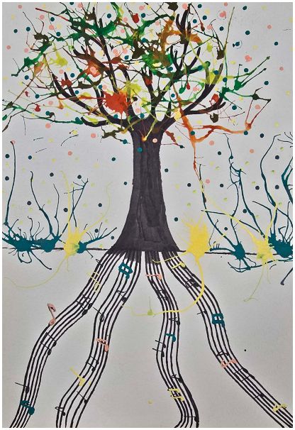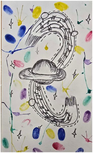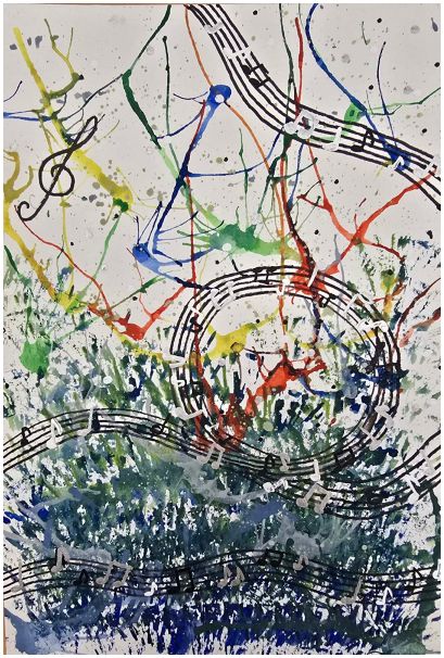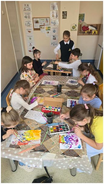 Kūrybiškumo ugdymo studijos vaikai, lydimi mokytojos Daivos, bandė muziką „pagauti“ spalvomis ir potėpiais. Klausydamiesi, kaip groja mokytojo Makso mokiniai. Vėliau jie savo įspūdžius perkėlė į piešinius – ryškius, jausmingus ir labai asmeniškus.