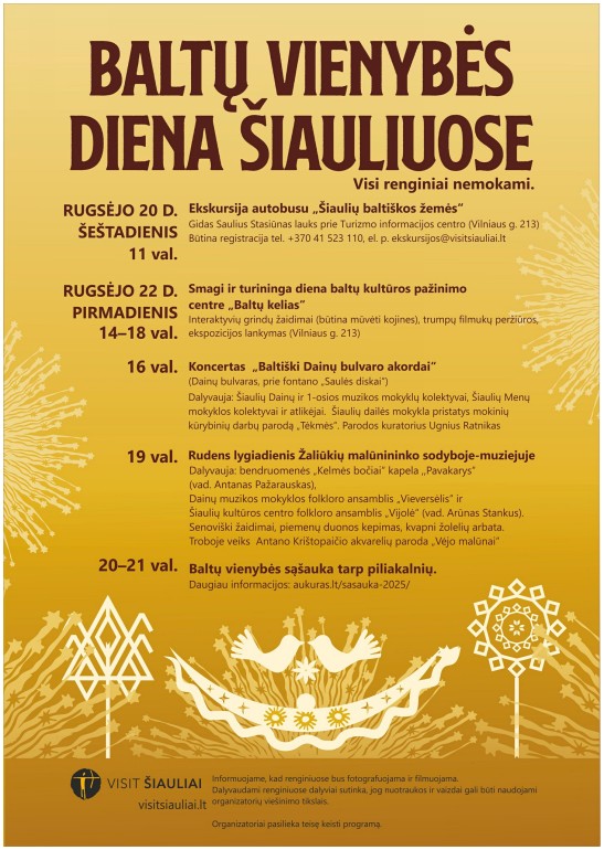 Rugsėjo 22-oji – ypatinga data Šiaulių kalendoriuje 1236 m. šią dieną įvykęs Saulės mūšis, siejamas su Šiaulių kraštu, tapo miesto istorijos pradžia Tad rugsėjo 22-oji – tai Šiaulių gimtadienis, kartu ir Baltų vienybės diena, kai piliakalnius papuošia vienybės ugnys ir bendrystės dvasia. Dar daugiau – ši diena žymi rudens lygiadienį, kai diena ir naktis tampa vienodos trukmės, o gamta primena apie ciklišką atsinaujinimą. Rugsėjo 22-oji pasaulyje taip pat minima kaip Tarptautinė diena be automobilio. Šiauliai kviečia šią ypatingą dieną pasitikti kartu – spalvingi renginiai džiugins ir dovanos prasmingų patirčių kiekvienam