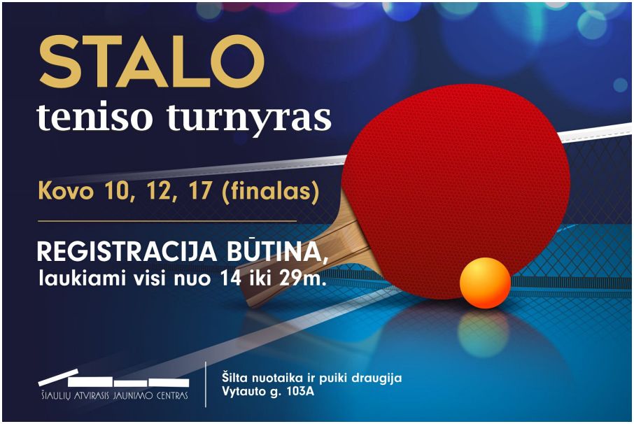 Vytauto g. 103A, Šiauliai Vytauto g. 103A, Šiauliai, LithuaniaKviečiame dalyvauti stalo teniso turnyre! Laukia, gera nuotaika ir puiki draugija. Turnyro datos: Kovo 17 d. – FINALAS Vieta: Šiaulių atvirasis jaunimo centras Vytauto g. 103A Laikas: visais etapais – 17:00 val. Registracija: https://forms.gle/56Ca4WFavvfXowgD7 Draugiškas susibūrimas, kalėdinė nuotaika ir smagus stalo teniso vakaras laukia tavęs. Prisijunk ir parodyk savo jėgas prie stalo teniso stalo!Iki […]