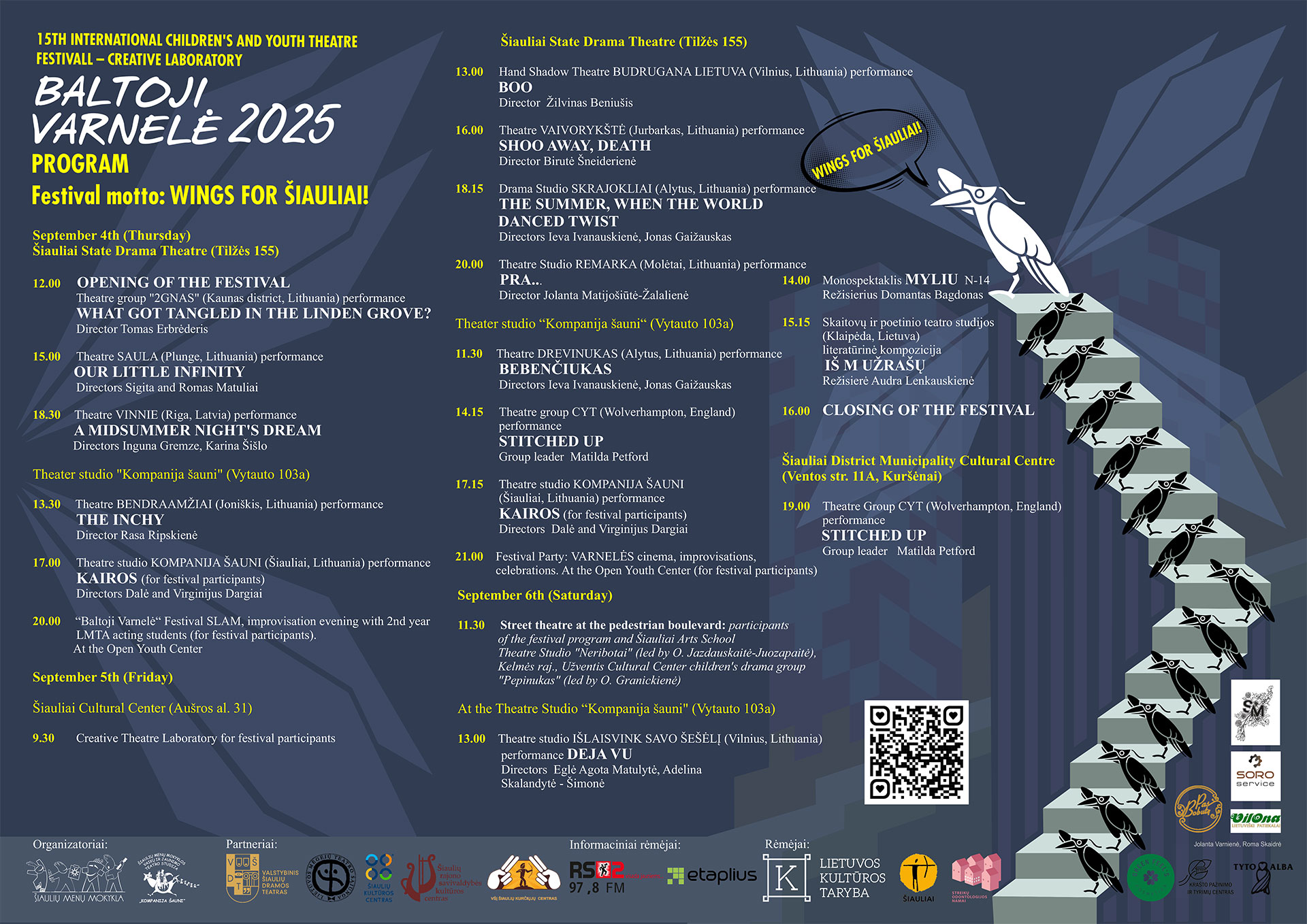 Rugsėjo 4–6 d. Šiauliuose vyks XV tarptautinis vaikų ir jaunimo teatrų festivalis-kūrybinė laboratorija „Baltoji varnelė 2025“ – o tai reiškia tik viena: miestą užlies kūrybos, teatro ir jaunatviškos energijos banga!