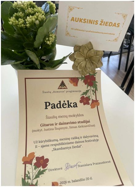 Šiaulių menų mokyklos gitaros ir dainavimo studijos mokiniai dalyvavo II-ajame respublikiniame dainos festivalyje „Skambantys žiedai“, vykusiame Šiaulių „Romuvos“ progimnazijoje. Šis renginys subūrė jaunuosius atlikėjus iš įvairių Lietuvos regionų, skatindamas muzikinę raišką, bendrystę ir kūrybinį dialogą.